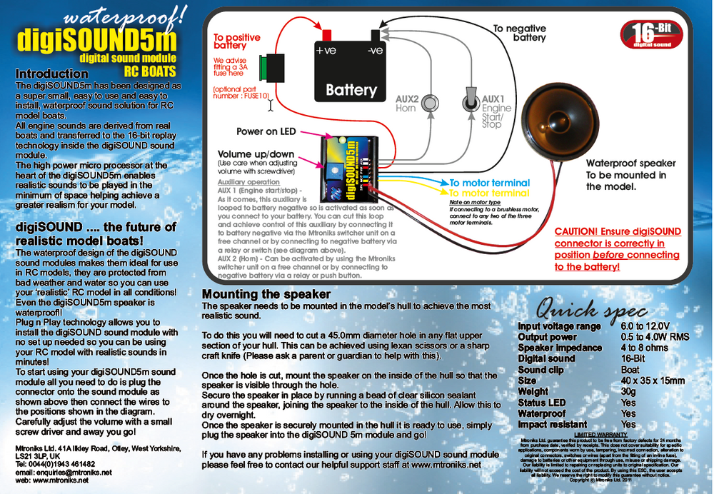 The digiSOUND5m is the new marine sound module from Mtroniks Ltd. It is the worlds first 100% waterproof, plug n play sound module designed to take the hassle out of giving your model a realistic sound! The sound module requires NO programming or set up, it comes with a realistic sound pre-installed leaving just the installation to complete before you can get under way! The unit comes complete with built in amplifier, wiring loom and even a 75.0mm diameter waterproof speaker!