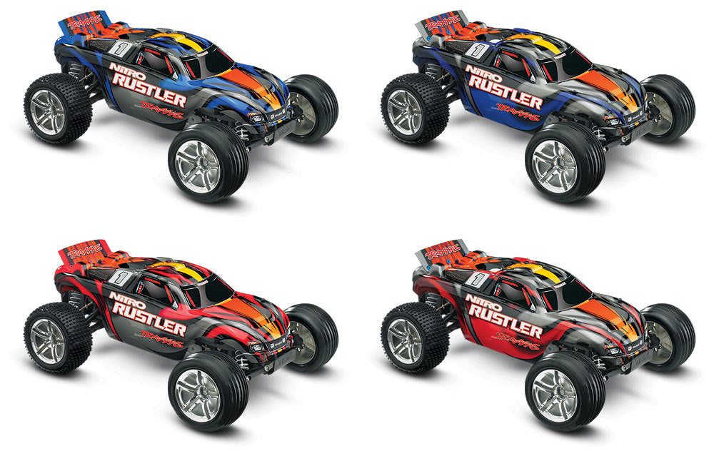 The sleek body design cheats the wind with its smooth curves and low-slung stance, while the outrageous graphics dominate with style. The separate wing securely bolts to the body with precise aluminum hex hardware. Chrome 2.8 Twin SpokeT rims are wrapped with pre-glued AliasT step-pin tires in the rear and AliasT ribbed tires up front. The high-tech rubber compound ensures great grip on a variety of surfaces. Grey-molded composite parts are thoughtfully integrated to enhance the look of the chassis. Fast, light, and loaded with power, Nitro Rustler's power-sliding, dirt roosting attitude will have you reaching for the throttle again and again.