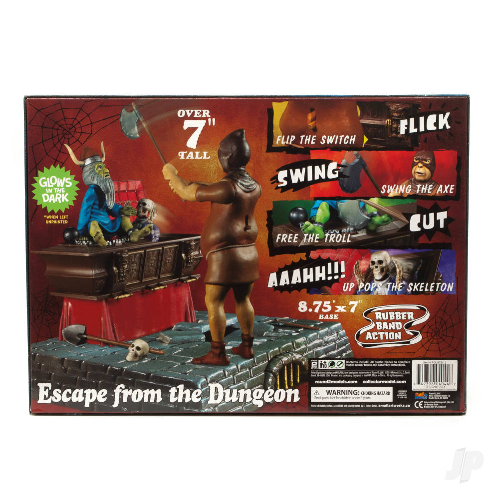 The Escape From the Dungeon glue-together model kit is the first release in the haunted Manor series of kits from Polar Lights that re-introduces fun, spooky models from years past. The kit features fine details on every part. It uses rubber band action to bring two moving figures. In Escape From the Dungeon, is the executioner offering a near miss or a favour that will free our diminutive friend? In either case, another long-dead ghoul has something to say about it!