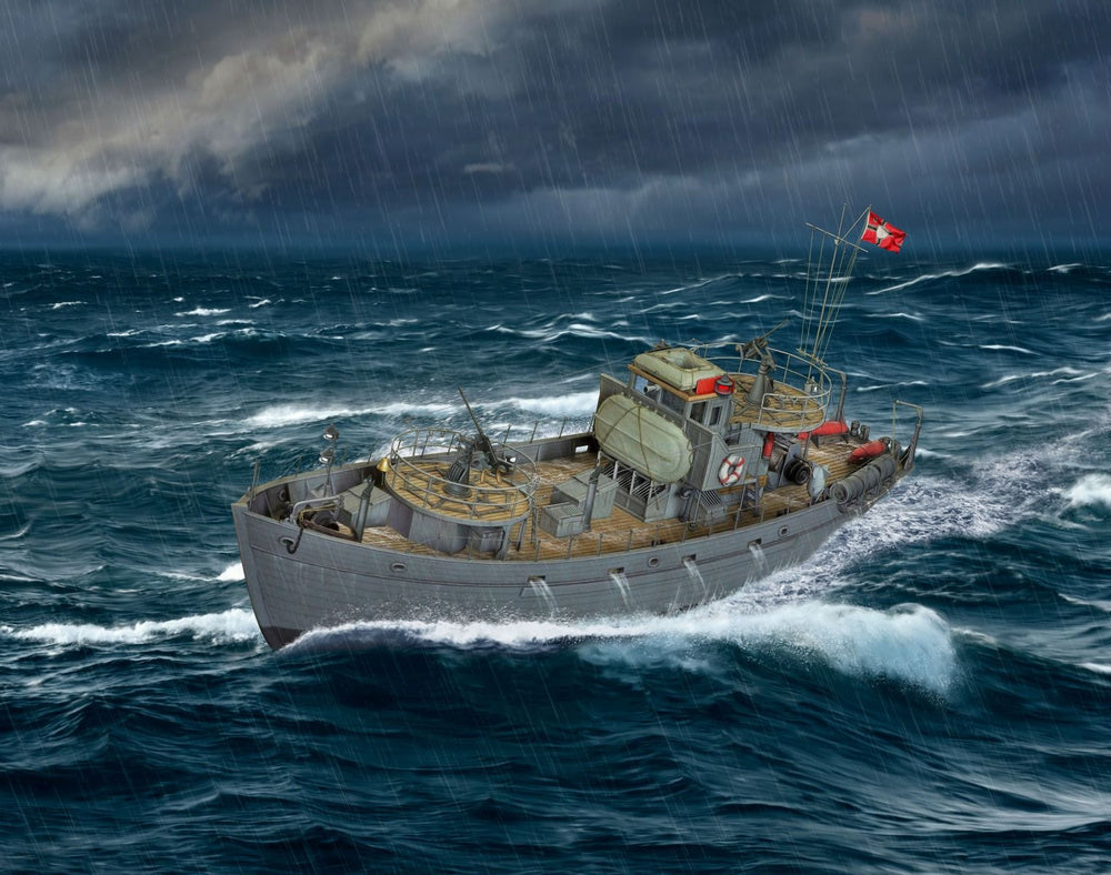 Universal boats of the KFK (Kriegsfischkutter) type were developed in late 1941 on the basis of a fishing seiner. They were built by various companies in Germany and other countries (including neutral Sweden). After a small re-equipping, they could be used as trawlers (they could carry contact, magnetic, and acoustic trawls), submarine hunters (a hydroacoustic station was installed on the boats), or patrol boats. The boats’ hulls were made of wood, but some shipyards made them of metal or composite according to their technological requirements.