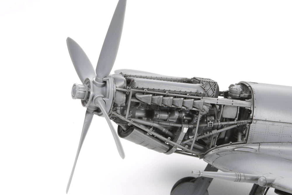The Supermarine Spitfire is one of the most widely recognized fighters of WWII. Designed by R.J Mitchell, the Spitfire is known for its exploits during the Battle of Britain. Throughout the war, the Spitfire"s engine technology evolved to compete with the newer Axis aircrafts. As a result, there are numerous variants of the Spitfire, which served with distinction in the RAF as well as in the air forces of other countries. The Spitfire Mk. IX was produced as a result of the German Fw190A fighter, which were superior to the earlier production Spitfire Mk. V. The new Spitfire Mk. IX was equipped with a Merlin Series 60/70 engine and two-stage supercharger. This improved the performance of the aircraft and allowed it to match the Fw190A in battle. The production of the Spitfire Mk. IX continued until the end of WWII. The most common Spitfire featured the "C" universal wing, which could be equipped with four 20mm cannons or two 20mm cannons and four 7.7mm machine guns. Some of the Spitfires were also fitted with bomb racks to allow the aircraft to be used as a fighter-bomber.