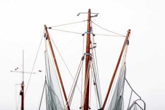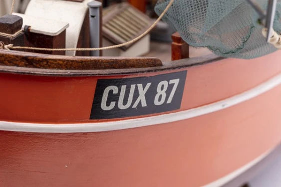 The Cux 87 is a typical German trawler from the Deutsche Krabbenkutter Werft. This type of boat is often seen in the small harbours along the North German coast. Built in 1952 in Cuxhafen, Germany. Tonnage 49.97 gross register tonnage. Lenght overall 18.35m. Beam 5.35m. Lenght of mast 9.9m. Motor 2-cylinder diesel 200 HP. Engine speed 10-12 knots. Crew3 men. Fishing tackle - 2 crab nets. Fishing area around the Danish island Römö and the Western coast of Germany!