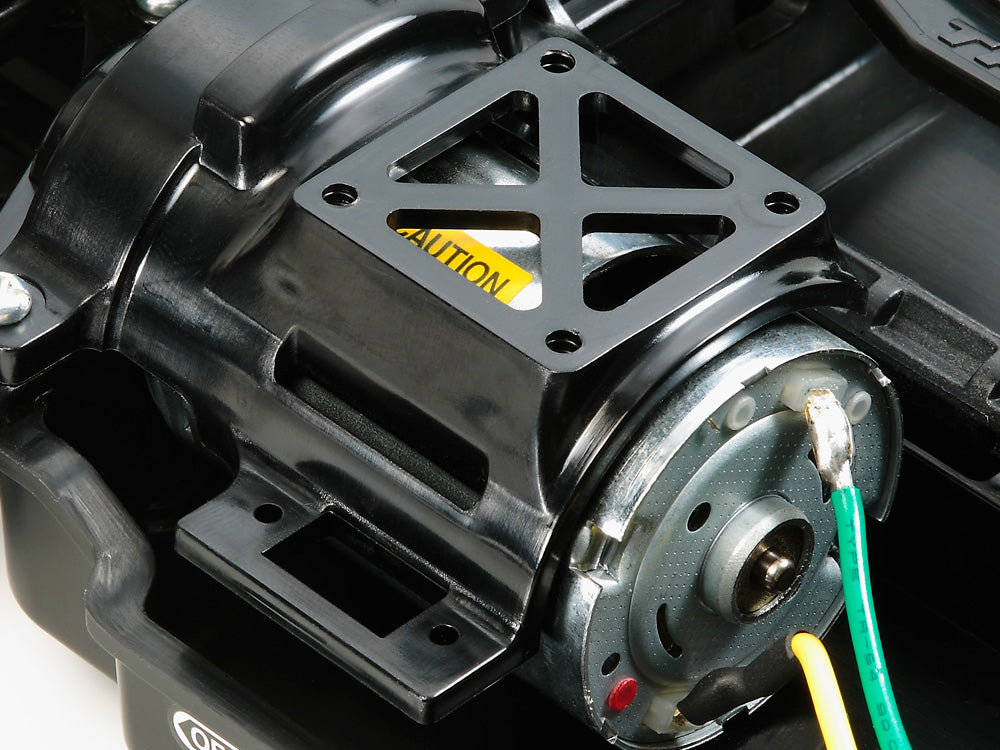 The shaft-driven 4WD TT-02 chassis employs a longitudinal layout with the battery on the left and the motor on the right, to give excellent stability. In addition, it features identical left and right suspension arms and uprights for ease of assembly, plus easy-to-maintain gearboxes. It is a highly adaptable chassis, as it offers 2 different wheelbases, 2 ground clearance settings and 2 tread set-ups in addition to a range of 10 possible gear ratios. It is not short on looks either, with brake disc-shaped wheel hubs and stylish front bumper supports. Black 12-spoke wheels are paired with slick tires for a racy finish.