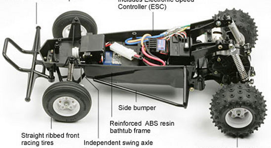but lightweight ABS resin bathtub frame, diff gear loaded sealed gearbox, oil filled rear dampers, powerful RS 540 motor and high performance