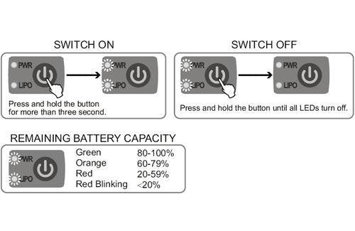 For switching on please press and hold the button for more than three seconds. The PWR LED and LIPO LED will turn on. For switching off please press and hold the button until all LEDs turn off. The PWR LED also shows you the remaining battery capacity when switched on.