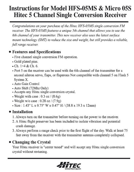 HITEC HFS-05MS 5 CHANNEL R/C RADIO CONTROL RX RECEIVER 35MHZ - SECOND HAND