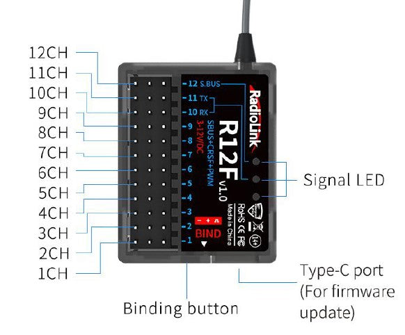 RadiolinkR12F, 12 channel receiver. 2.4g FHSS spread spectrum algorithm & 67 channel pseudo-random frequency hopping. Supports PWM, SBUS & CRSF signal. It is high voltage servo supported & can get the new functions by updating the firmware, R12F is compatible with Radiolink T16D/T12D/T8FB/T8S/RC8X/RC6GSV3/RC4GS V2/RC6GS/RC4GS transmitters.