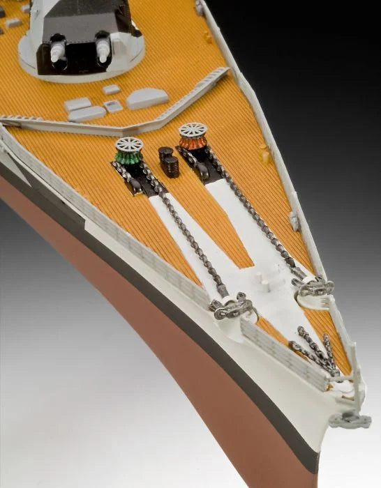 What makes this model kit truly unique are its myriad special features. The highly detailed design of the hull and propulsion shafts gives the model an unparalleled authenticity. The individually movable 38 cm gun turrets and the numerous anti-aircraft guns make the heart of every precision engineer beat faster. In addition, the optional open or closed aircraft hangar doors provide an extra dose of realism.