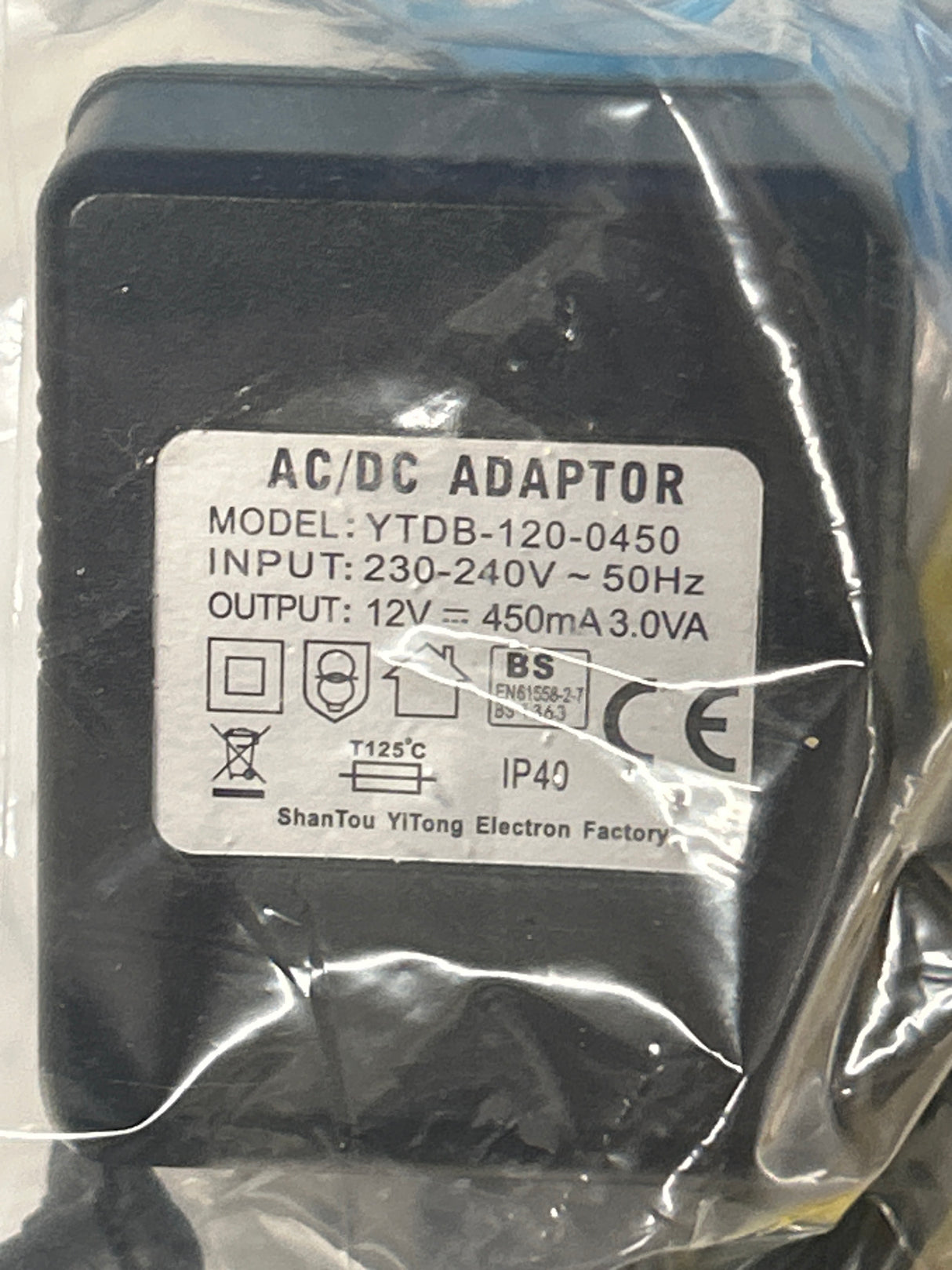AC/DC Adaptor YTDB-120-0450 12v 450mA 3.0VA Charger will be backordered from our supplier. Delivery will take between 3-5 working days & orders will be despatched once completed.