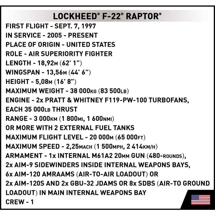 LOCKHEED® F-22® Raptor® is an advanced fifth-generation multi-role fighter. This still somewhat mysterious and closely guarded aircraft was accepted into service with the United States Air Force and is subject to a total export ban to other countries. Thanks to the licensing agreement, COBI can produce the now legendary Raptor.