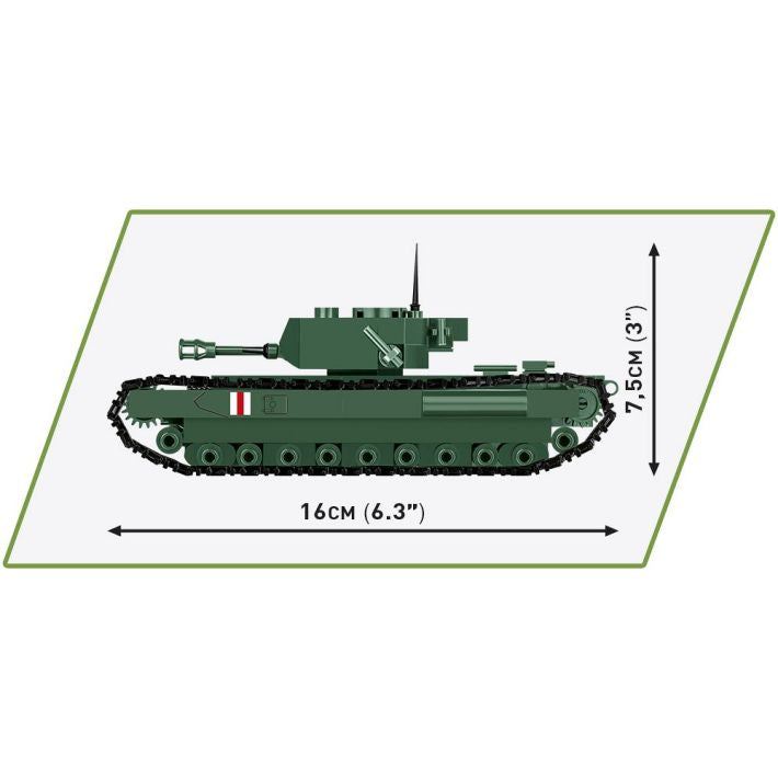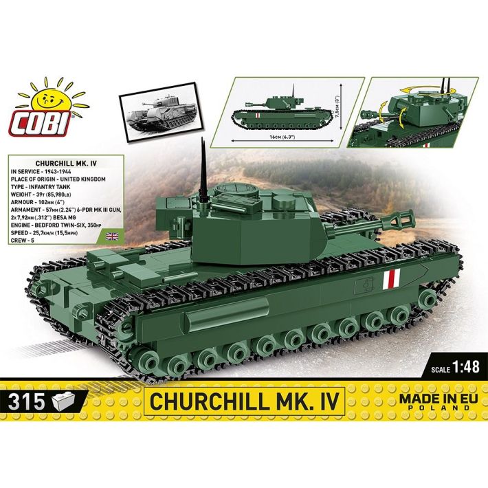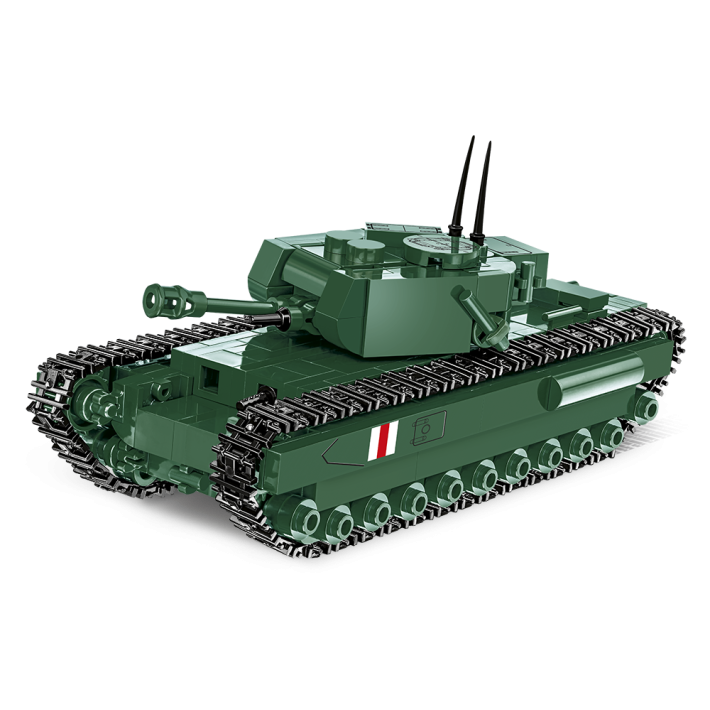 The Churchill MK. IV model from COBI construction blocks was produced in 1:48 scale. Noteworthy is the dark shade of green, so far rarely used in COBI models. The set is easy to build, perfect for the beginning of the adventure with Polish construction blocks. It has a movable cannon, a rotating turret and working tracks. All graphic details are high-quality prints that do not wear off even during intensive use. The advantage is the design that uniquely reflects the original shapes of its historical inspiration. The model of the Churchill tank will be perfect as a toy, but also a unique element of any collection of a fan of military and armored weapons.