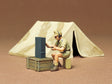 This is a 1/35 scale plastic model assembly kit depicting a WWII German Africa Corps soldier outside a tent. ★Choose whether to assemble with the entrance flap open or closed. ★The figure is depicted seated on a jerry can and working on radio equipment.