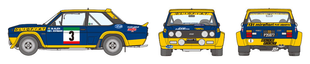 The Fiat 131 Abarth Rally is the front engine rear drive car which made a rally debut in 1976 and took titles in '77, '78 and '80. The famous Italian car-tuning brand Abarth developed this car as an Abarth-tuned version of the Fiat 131 Mirafiori with 1,995cc inline-4 DOHC 4-valve engine capable of 215hp, and 4-wheel independent McPherson strut suspension with front/rear ventilated disc brakes. Also, it was extremely lightweight thanks to extensive use of FRP and aluminum across its body. The version of 1976 and 1977 was finished in a navy blue and yellow livery based on the colors of Olio Fiat.