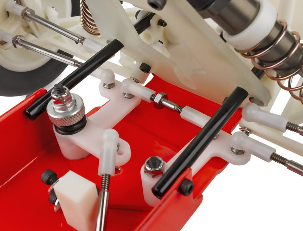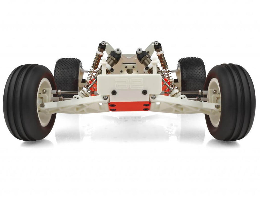 Truck racing wheels and tires were also developed specially for the RC10T. This re-release RC10T comes with standard wide mini pin rear tires, neon red powder coated chassis, and the famously banned narrow front tires. All wheels are lightweight, 3-piece modular design, moulded perfectly concentric in virgin nylon. The narrow front tires were designed for the existing ROAR Truck Class rules of the era, and used on the winning prototype RC10T’s.