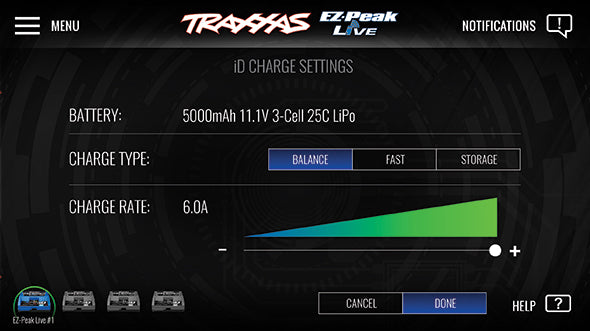 The EZ-Peak Live app gives you detailed information, remote monitoring, and advanced operating functions through the high-definition color interface on your device. It's our finest charger in the popular EZ-Peak iD lineup. Along with the new technology, we added more charging power, up to 12-amps for 2s LiPo batteries! Your batteries are charged faster so you can get back to the fun of driving sooner.