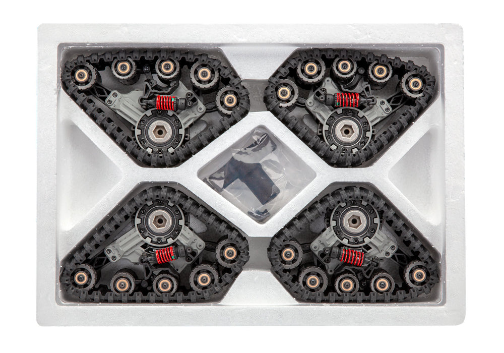 New all-terrain Traxx provides the most significant traction upgrade you can make to the TRX-4. The TRX-4 already has a go-anywhere attitude and the gear to match, but installing a set of Traxx yields a machine that feels practically unstoppable on virtually any terrain. The enormous contact patch and grippy treads shrug off the deepest mud and float across deep sand. Traxx raises the portal axles even higher (over 16mm!) for increased ground clearance that lets you straddle huge obstacles on the trail.