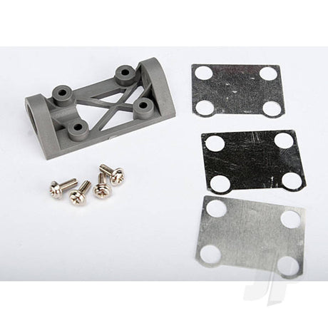 Bearing block front (supports front shaft) / belt tension adjustment shims (front / middle) / screws