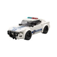 A fun self-build brick model of a modern American police car with white, blue, and black colour scheme. It features detailed exterior design with manual forwards/backwards movement, making it ideal for play and display alike.
