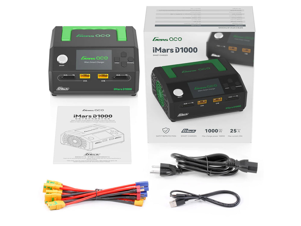 The compact iMars D1000 charger is engineered for high-capacity RC LiPo batteries, delivering AC 1000W of charging power. Equipped with advanced G-Tech smart technology, it ensures simple, safe, and efficient operation.