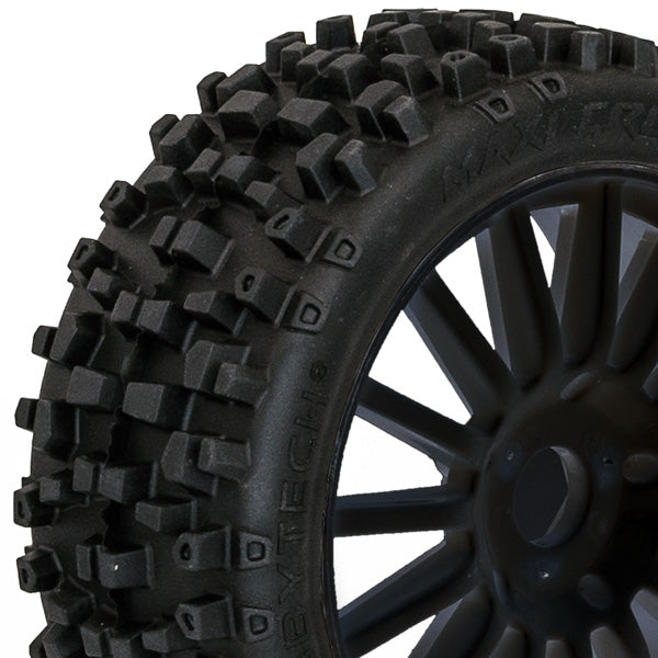 HobbyTech (Accessories) Maxi Cross 1/8th pre-glued buggy tyres on black spoked wheels pair