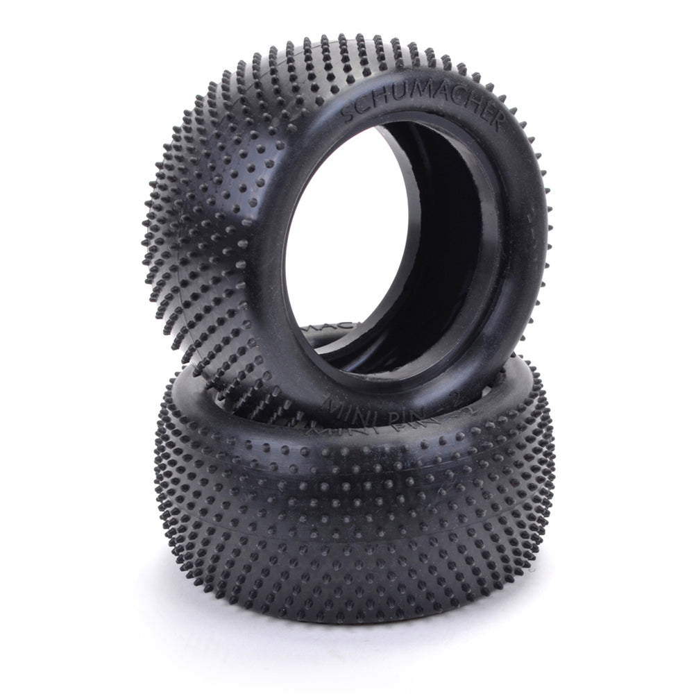 The Mini Pin 2 rear tyre, this is a tyre for high grip astro and carpet racing. The new tyre has a thinner wall thickness which is aimed at providing more traction and improved bump handling. The pins have been designed to have more of a radius edge as opposed to the square edge on the previous and hugely popular Mini Pin tyre. This allows the tyre to work perfectly straight from the packet, without the need for bedding in. The Mini Pin 2 is available in Yellow, Silver and hard wearing Blue compound, the Yellow is available pre-glued on the Flexlite 12mm hex wheel.