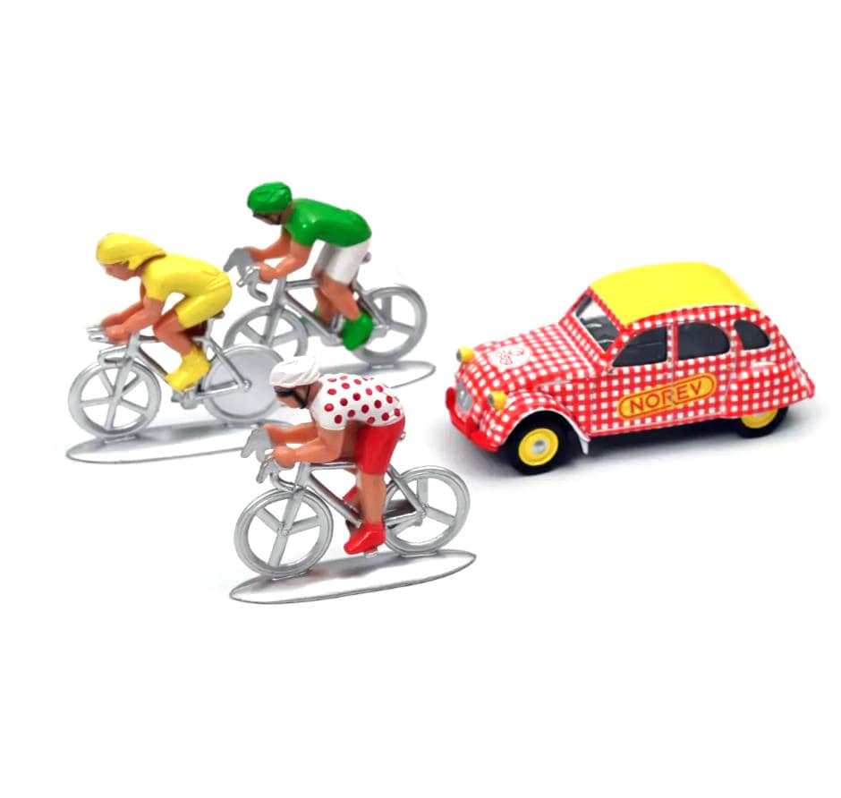 Citroen 2CV and 3 tour cysclists. Fun little play set for all young buddy endurance cyclists.