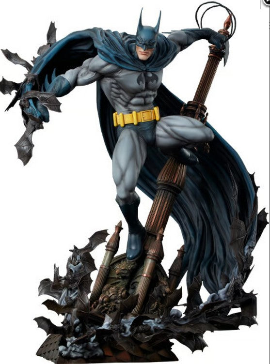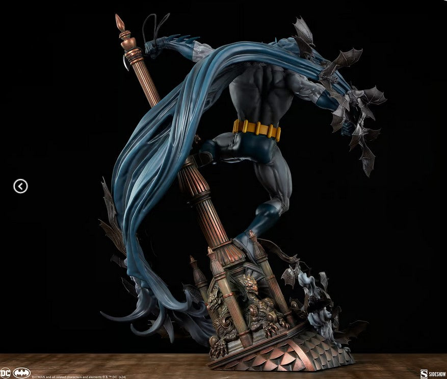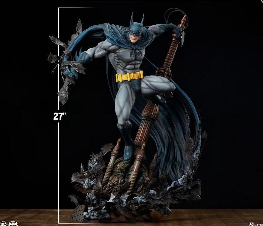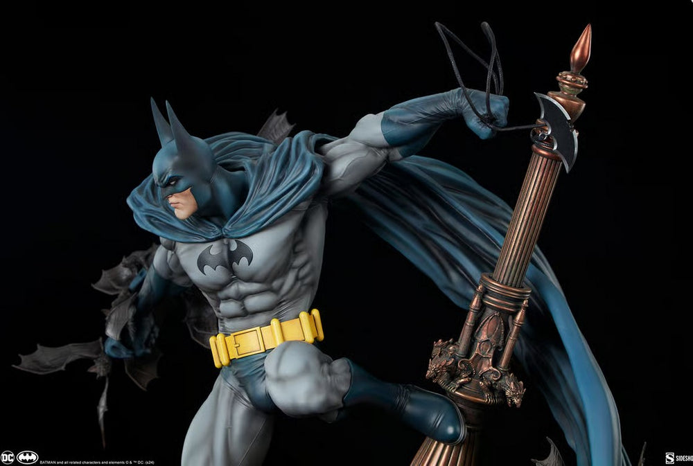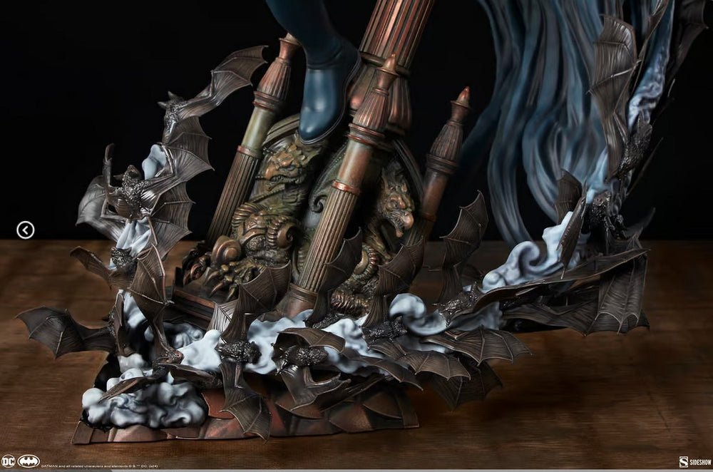 Measuring 27” tall, 21” wide, and 20” deep, the Batman Premium Format Figure finds Gotham City’s nocturnal super sleuth balanced at the summit of a church steeple. Bruce Wayne’s alter ego searches for clues to help him solve his current case while he grapples onto a crooked spire far above the city streets. As a colony of bats swarms around and morphs into his long, billowing cape, Batman becomes a prowling creature of the night who is able to stalk any enemy through the deepest shadows and the most dizzying heights.