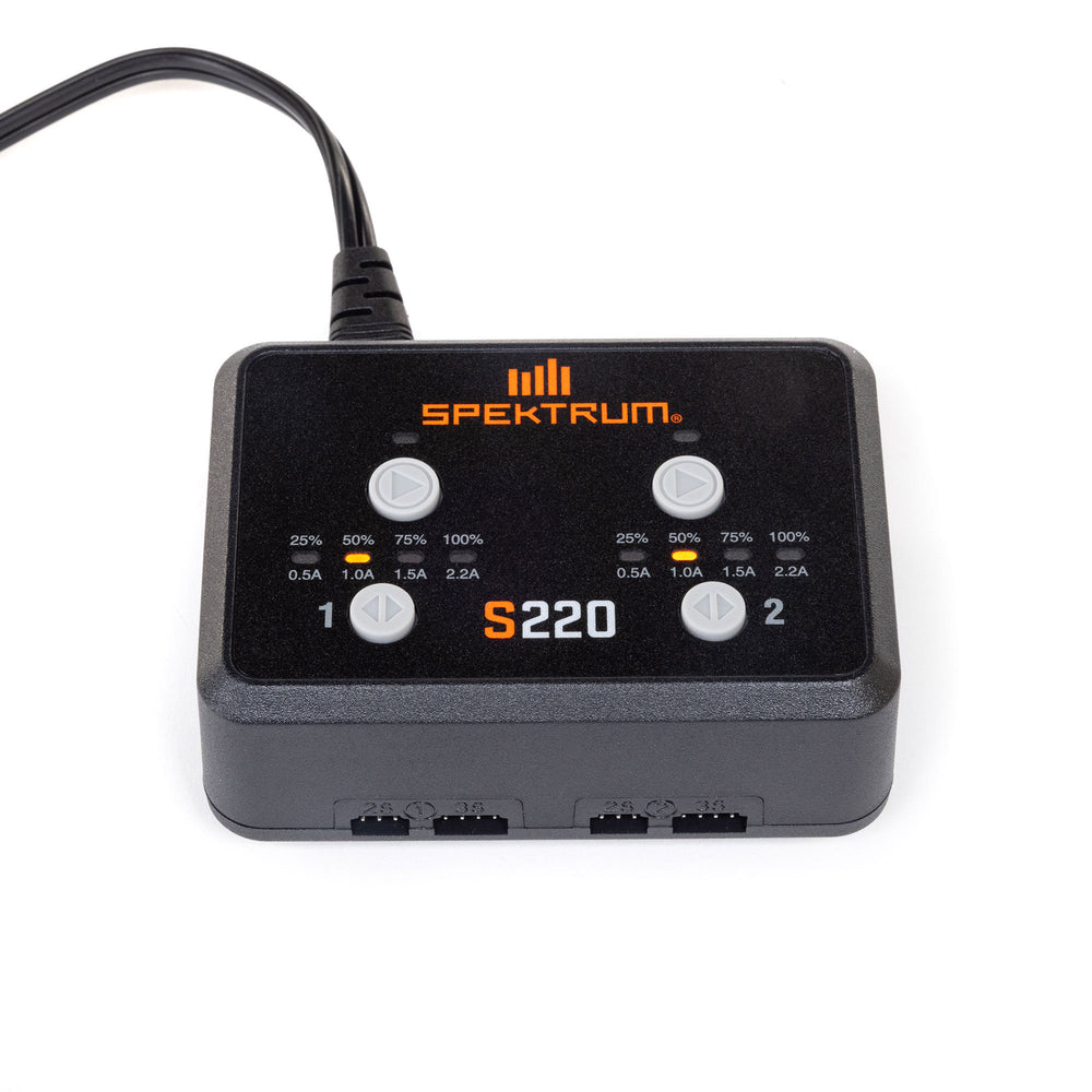 The Spektrum™ S220 AC 2x20W Balance Charger is a compact and efficient solution for charging up to two LiPo batteries at the same time. Featuring dual JST-XH balancing plugs for 2S and 3S LiPo batteries, the charger sends up to 20W of power per channel. This Spektrum charger delivers a versatile and truly hassle-free charging experience. The design and lightweight build make this charger ideal for anyone looking for fast, efficient charging for Mini and Micro models.