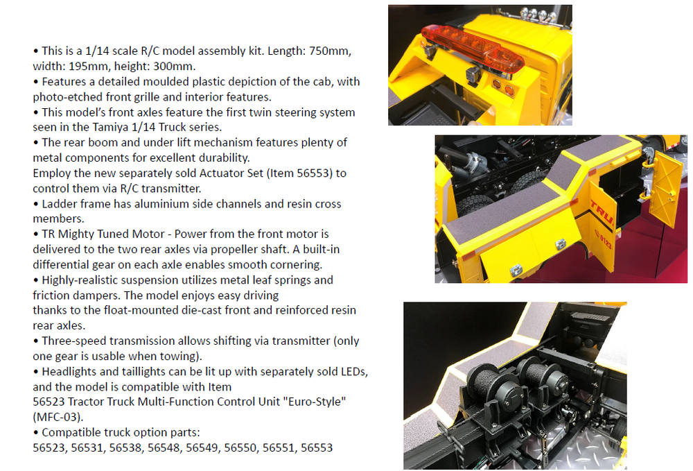 Headlights and taillights can be lit up with separately sold LDEs and the model is compatible with item 56523 Tractor Truck Multi-Function control unit ''eur0-style'' (MFC-03)