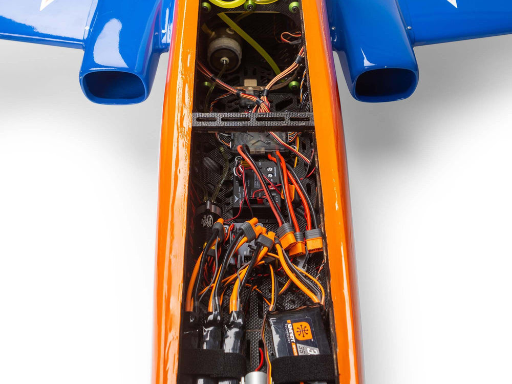 The convenient hatches are large for easy access to vital components such as the electronics and batteries. The two-piece plug-in wing makes this large airplane easy to transport and assemble with minimal fuss so you can arrive at the field and be in the air quickly.